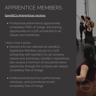 Apprentice Members are 14-22 year old high school and college-aged students who receive free performance opportunities and a partial scholarship to train with Garet&Co.