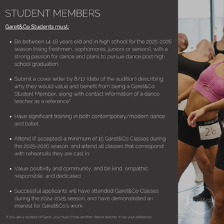 Student Members are 14-18 year old high school students who are planning to pursue dance in the future, and receive completely free training and performance opportunities with Garet&Co.